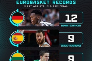 根據(jù)數(shù)據(jù)統(tǒng)計,施羅德此役送出12次助攻,這是歐錦賽半決賽歷史紀(jì)錄。此前的紀(jì)錄保持者是西班牙球員塞爾吉奧-羅德里格斯和立陶宛球員曼塔斯-卡尼提斯,兩人都曾在歐錦賽半決賽上送出9次助攻。
