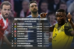 體育資訊9月15日訊 德甲官方統(tǒng)計了德國各俱樂部的注冊會員數(shù)量,并列出榜單,拜仁41萬名會員居首,多特23萬名會員次席。
