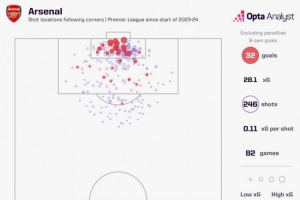 不包括烏龍球(因為沒有預期進球值),阿森納在這段時間里預期進球28.1的情況下攻入32球。僅看本賽季,阿森納在英超中主罰了45個角球,比任何其他球隊至少多4個,其中賴斯主罰了24個。這些角球產(chǎn)生了18次射門,其中有6次轉(zhuǎn)化為進球。這意味著阿森納在超過三分之一的角球進攻中都能形成射門,并且有三分之一的射門能夠成功得分。