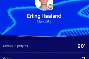 哈蘭德在本場比賽首發(fā)出戰(zhàn),4射門3射正,打進2球,評分8.8全場最高。
