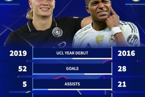 上一篇: 哈蘭德vs姆巴佩前50場歐冠數(shù)據(jù)對比:進球52-28,助攻5-21