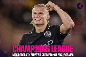 歐冠前50場(chǎng)進(jìn)球榜:哈蘭德52球居首,范尼43球次席、凱恩34球第三