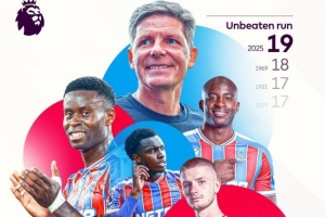 據(jù)英超官方統(tǒng)計(jì),水晶宮各賽事19場不敗,創(chuàng)造隊(duì)史最長不敗紀(jì)錄。