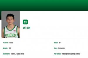 俄勒岡大學(xué)男籃官網(wǎng)已經(jīng)上線林葳個人信息,身高6英尺4英寸(約1米93),體重190磅(約86公斤),年級一欄標(biāo)注是大二。