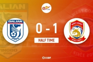 傷停補時4分鐘。上半場比賽結(jié)束,大連英博0-1青島西海岸。