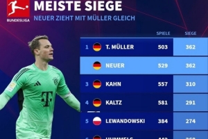 體育資訊10月5日訊 德轉(zhuǎn)統(tǒng)計(jì)了德甲球員獲勝場(chǎng)次排名,諾伊爾362場(chǎng)追平托馬斯-穆勒,并列第一。