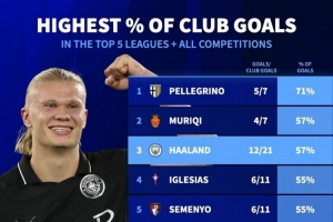 體育資訊10月7日訊 德國轉(zhuǎn)會市場統(tǒng)計(jì)了本賽季球員進(jìn)球占比,哈蘭德攻入曼城57%的進(jìn)球,占比并列第二高,姆巴佩54%、凱恩47%。
