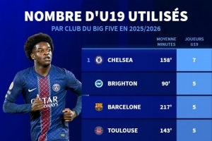 本賽季五大聯(lián)賽球隊(duì)使用U19球員數(shù)量排名(括號(hào)內(nèi)為平均出場(chǎng)時(shí)間):