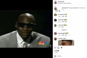 詹姆斯的好基友凱文-樂福更新IG曬出喬丹的演講視頻,并打趣詹姆斯:“決定二”。