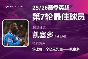 2025-2026賽季英超火熱進(jìn)行中,體育資訊和咪咕體育聯(lián)合發(fā)起每輪英超最佳球員評選活動!第7輪評選結(jié)果出爐,切爾西后腰凱塞多攻防兼?zhèn)?,轟入世界波幫助切爾西2-1戰(zhàn)勝利物浦,獲得吧友5.6萬票的支持,當(dāng)選 【體育資訊X咪咕體育英超第7輪最佳球員】!