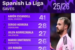 西甲撲救次數(shù)排行:皇家奧維耶多門將埃斯坎德爾41次居首