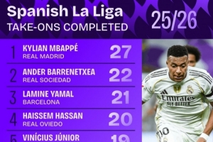 體育資訊10月7日訊 日前,Squawka統(tǒng)計(jì)了本賽季西甲過人次數(shù)排行,姆巴佩以27次過人居首。