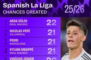 西甲創(chuàng)造機(jī)會(huì)次數(shù)排行:居勒爾22次居首 佩德里、姆巴佩并列第二