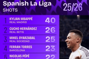 西甲射門次數(shù)排行:姆巴佩40次居首 費(fèi)蘭-托雷斯第四、亞馬爾第八