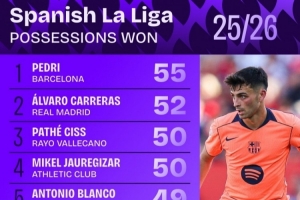 體育資訊10月7日訊 日前,Squawka統(tǒng)計了本賽季西甲奪回球權次數(shù)排行,佩德里55次居首,卡雷拉斯52次第二。