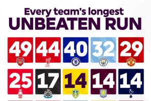 英超官方盤點(diǎn)了聯(lián)賽中每支球隊目前的最長不敗紀(jì)錄,并發(fā)問:“你覺得阿森納的紀(jì)錄會有被打破的那一天嗎?”
