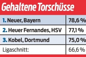 體育資訊10月8日訊 《體育圖片報》統(tǒng)計了本賽季門將在德甲聯(lián)賽中的撲救成功率,并列出前三名榜單,拜仁39歲門將諾伊爾以78.6%居首。