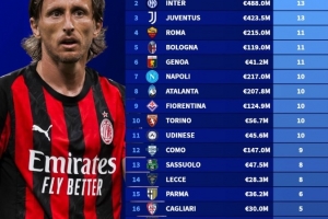 1、米蘭(15人):總身價3.58億歐元