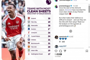 體育資訊10月10日訊 根據(jù)英超官方的數(shù)據(jù)統(tǒng)計(jì),自2023-24賽季開始至今,阿森納零封場次在所有英超球隊(duì)中排名第一,他們有35場比賽沒有丟球。