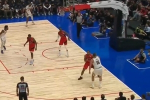 當(dāng)時約基奇被打,轉(zhuǎn)身之后底線一端單臂大掄傳將球送給另一端的卡梅隆-約翰遜,但后者三分沒能命中。