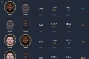 媒體人Jacob分享了一組詹姆斯和東契奇上賽季同場與否的凈效率對比。