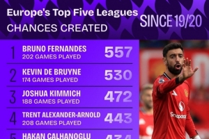 體育資訊10月10日訊 據(jù)Squawka統(tǒng)計(jì),2019-2020賽季以來(lái),B費(fèi)創(chuàng)造557次機(jī)會(huì),五大聯(lián)賽同期最多。
