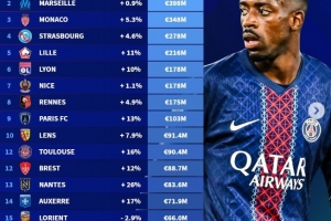 法甲俱樂部身價排行:巴黎11.5億歐斷層領(lǐng)先,馬賽3.98億歐次之