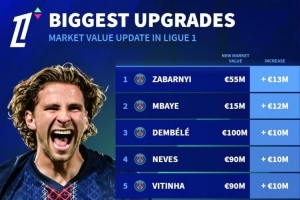 體育資訊10月12日訊 德國轉(zhuǎn)會(huì)市場(chǎng)更新法甲球員的身價(jià),并列出身價(jià)上漲榜單,扎巴爾尼+1300萬歐居首,巴黎球員占據(jù)前7名。
