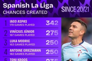 體育資訊10月12日訊 Squawka統(tǒng)計了20-21賽季以來球員在西甲創(chuàng)造機(jī)會的次數(shù),并列出榜單,阿斯帕斯342次居首,維尼修斯275次第二。