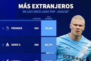 體育資訊10月14日訊 根據(jù)德國轉(zhuǎn)會市場的數(shù)據(jù),本賽季五大聯(lián)賽英超外籍球員占比最高,西甲外籍球員占比最低。