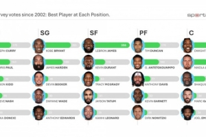 體育資訊10月14日訊 今日,NBA數(shù)據(jù)專(zhuān)家Todd Whitehead統(tǒng)計(jì)了自從2002年以來(lái)聯(lián)盟總經(jīng)理調(diào)查投票對(duì)于“各個(gè)位置最佳球員”的得票最多球員。