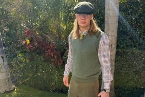 哈蘭德社媒曬出穿搭照片,背景是郁郁蔥蔥的綠色植被,哈蘭德頭戴綠色帽子,身上穿著綠色馬甲,內搭格子襯衫,下身穿著橄欖綠褲子,手拎黑綠色帆布包包。