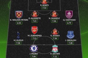 中場:庫杜斯(熱刺,7場1進(jìn)球5助攻)、蘇維門迪(阿森納,7場2進(jìn)球)、扎卡(桑德蘭,7場3助攻)、格拉利什(埃弗頓,7場1進(jìn)球4助攻)