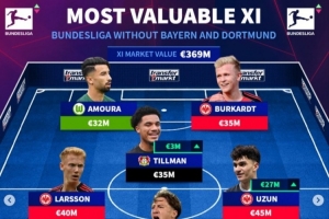 體育資訊10月15日訊 德轉更新了德甲球員身價,同時列出德甲除拜仁多特外身價最高的球員陣容,法蘭克福5人、勒沃庫森2人,斯蒂勒盧克巴在列。