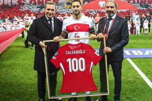 恰爾汗奧盧在對(duì)陣保加利亞的比賽中達(dá)成國(guó)家隊(duì)出戰(zhàn)100場(chǎng)里程碑,此役賽前土耳其隊(duì)向他頒發(fā)了紀(jì)念球衣。