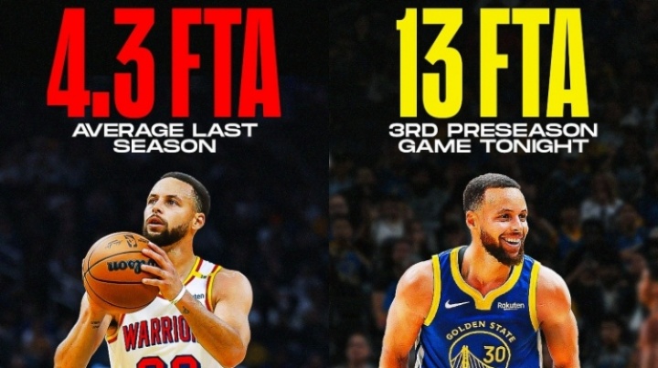 對(duì)陣開(kāi)拓者的第三場(chǎng)季前賽中,庫(kù)里獲得了13次罰球機(jī)會(huì)。盡管他上賽季場(chǎng)均突破次數(shù)位列聯(lián)盟前15,但其場(chǎng)均罰球數(shù)僅為4.3次。