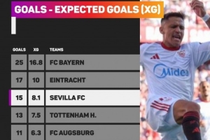 3.塞維利亞:15球,預(yù)期進(jìn)球數(shù)8.1,正負(fù)值+6.9