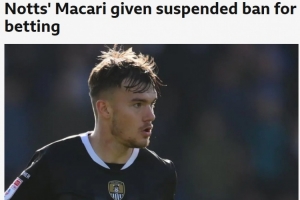 據(jù)了解,麥卡里總計下注金額略高于3000英鎊,凈損失約470英鎊。由于這些投注發(fā)生在18歲至20歲期間,監(jiān)管委員會在其書面理由中指出,麥卡里對英足總的博彩規(guī)則表現(xiàn)出了一定程度的故意忽視。
