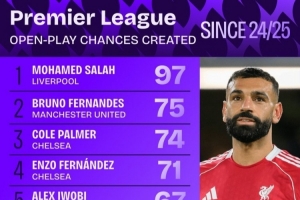 體育資訊10月16日訊 日前,Squawka統(tǒng)計(jì)了英超運(yùn)動(dòng)戰(zhàn)創(chuàng)造機(jī)會(huì)次數(shù)排行,薩拉赫居首,B費(fèi)、帕爾默分居二三位。