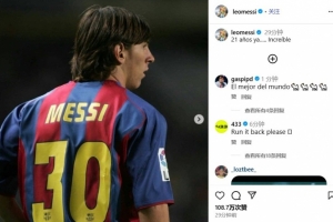 梅西發(fā)布了一張他身穿巴薩30號球衣的經(jīng)典舊照,并配文寫道:“已經(jīng)21年了……難以置信?!?/p>