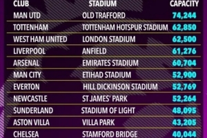 體育資訊10月17日訊 《太陽報(bào)》對比上個(gè)賽季和本賽季的英超手冊,發(fā)現(xiàn)有五支英超俱樂部的球場容量較上賽季有所變化。