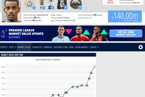 體育資訊10月17日訊 德國(guó)轉(zhuǎn)會(huì)市場(chǎng)今天更新了英超球員的身價(jià),利物浦今夏創(chuàng)紀(jì)錄引進(jìn)的前鋒伊薩克從1.2億歐漲至1.4億歐,德轉(zhuǎn)管理員解釋了此次上漲的原因。