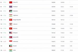 體育資訊10月17日訊 IFA更新最新一期國家隊排名,亞足聯(lián)國家隊方面,國足積分不變,但排名從世界第94位升至世界第93位,亞洲排名則仍是第14位。