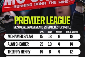 體育資訊10月17日訊 北京時間10月19日晚上,利物浦將在英超第8輪比賽中主場對陣曼聯(lián),Squawka統(tǒng)計了球員在對陣曼聯(lián)的英超比賽中的參與進(jìn)球數(shù)量,薩拉赫19球居首。