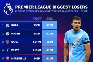 體育資訊10月17日訊 德轉統(tǒng)計了最新的英超球員身價跌幅榜單,曼城中場羅德里和福登身價均下降2000萬歐元,分列前二,阿森納四人上榜。