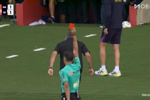 比賽補(bǔ)時(shí)階段,弗里克不滿裁判,兩黃變一紅被罰下,他將無(wú)緣下輪的國(guó)家德比。