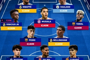 中場(chǎng):維尼修斯(皇馬,1.5億歐)、佩德里(巴薩,1.4億歐)、穆西亞拉(拜仁,1.4億歐)、貝林厄姆(皇馬,1.8億歐)、亞馬爾(巴薩,2億歐)