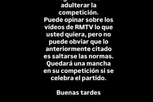 卡瓦哈爾:你好,特巴斯先生。違反規(guī)定就是玷污比賽。你可以對(duì)此前皇馬TV發(fā)布的視頻發(fā)表你想要說的任何意見。但你不能否認(rèn)之前所提到的內(nèi)容(海外賽)就是違反了規(guī)則。如果進(jìn)行海外賽,你的比賽就會(huì)有污點(diǎn)。