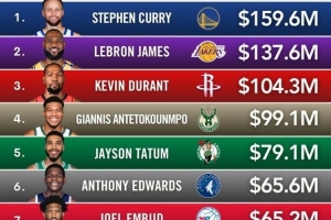 上一篇: 本年度球星收入排行:庫里1.596億居首 詹姆斯1.376億居次 KD第三