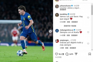 馬競前鋒阿爾瓦雷斯此役踢滿全場,賽后他在社交媒體上曬出比賽照片,配文:“抬起頭,繼續(xù)前進。”
